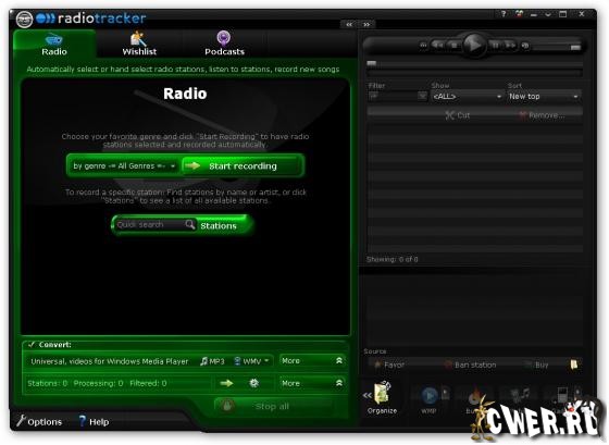 RadioTracker - программа, использующая около 15.000 интернет-радио станций для прослушивания и записи музыки в формате mp3. Возможности программы довольно велики: поиск нужной музыки, разбивка на разные жанры (Dance/House, Pop, Rap, Rock, Techno, Metal, Jazz, 80s, 70s и т.д.), при сохранение треков сохраняется и вся информация об исполнителе и прочая нужная информация, возможность использования фильтров для очистки от рекламы и прочих шумов на радио.