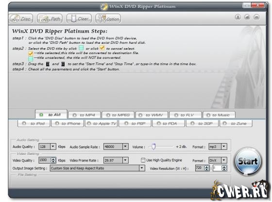 WinX DVD Ripper Platinum - это супер DVD риппер, поддерживает все коммерческие DVD и может снять все ограничения. Вы можете конвертировать и копировать ваши DVD в AVI, DivX, MP4, MPEG1-2, FLV, WMV, ASF видео файлов формата IPod, iPhone, мобильные 3GP, PSP, PDA.