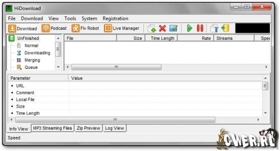 HiDownload - менеджер загрузок. Поддерживает работу по протоколам HTTP, FTP, RTSP (Windows Media), PNM, MMST и MMSU (это значит, что потоковое аудио - RA, RM и Apple Quicktime Streaming - можно "скачать" без проблем). Может работать через прокси, позволяет просматривать архивы и скачивать из них только необходимые файлы, позволяет сохранять Flash, имеется встроенный поиск MP3-файлов. Кстати говоря, есть у этой программы и внутренний поиск.