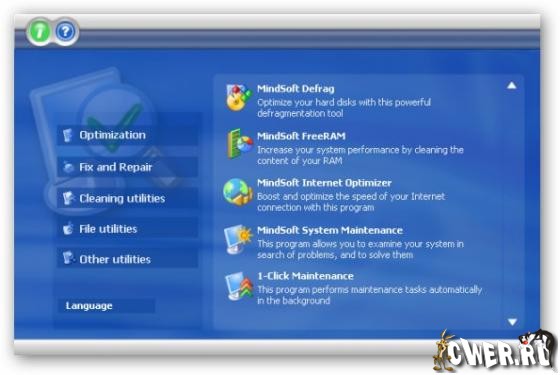 MindSoft Utilities XP - мощный инструмент, содержащий более 20 утилит, которые позволяют оптимизировать и настроить систему под управлением Windows XP. Можно дефрагментировать диски, память, оптимизировать соединение с Интернет, очистить диски от мусора, ускорить запуск приложений и многое другое, а также узнать всё относительно аппаратного и программного обеспечения компьютера.