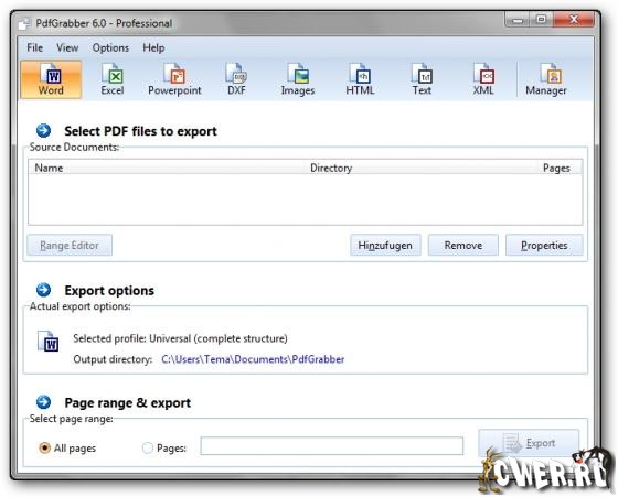 Немецкая программа PdfGrabber Professional позволяет легко и просто конвертировать PDF-документы во все ключевые форматы и обратно в PDF, посредством виртуального PDF-принтера . При конвертации сохраняет примененные оригинальные шрифты документа, вложения и форматирование. Имеет своего редактора для определения какая часть или элементы документа будут экспортироваться, какие конвертироваться, а какие удалятся (текст, формы, ссылки, аннотации, изображения, цифровые подписи и т.д.). Выбор конвертации всего документа, постранично, диапазона страниц и прочее. Позволяет создавать профили экспорта-конвертирования, автоматический мониторинг входящей папки и различные параметры командной строки и т д.