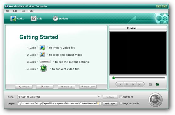 Wondershare HD Video Converter - конвертер видео файлов различных форматов в HD видео. Подерживает огромное количество форматов: MP4, MOV, 3GP, AVI, WMV, MKV, RM, MPEG-1, MPEG-2, FLV, ASF, NSV, HD ASF, HD AVI, HD MP4, HD MOV, HD WMV, HD MPG, HD VOB. Поддерживаются мобильные устройства iPod, Zune, PSP, Creative Zen, Archos, Xbox 360, iRiver. В программе реализован пакетный режим конвертирования и предварительный просмотр результата во встроенном проигрывателе. Данный конвертер отличается высокой скоростью работы и высоким качеством результата.