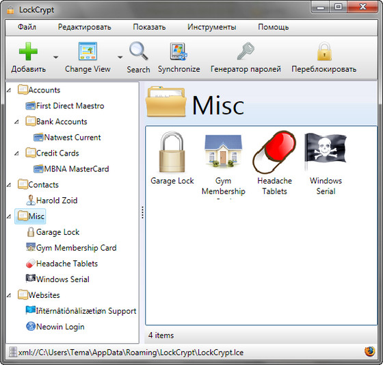 LockCrypt - программа для ведения базы учетных записей, паролей и прочей конфиденциальной информации. LockCrypt предоставляет безопасную, центральную базу данных для того, чтобы хранить трудно запоминаемые пароли и другую личную информацию.