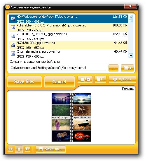 - Сохранение картинок и флэш файлов в указанную папку на жестком диске