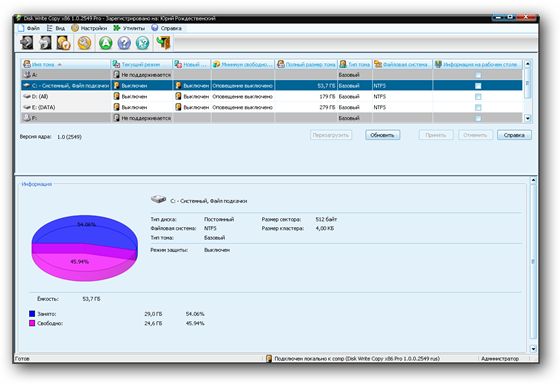 Disk Write Copy - программа, позволяющая мгновенно восстанавливать работоспособность операционной системы при любых неполадках. С этой программой можно использовать компьютер без ограничений и запускать любые программы даже с неизвестным происхождением. При этом Вы можете не волноваться о данных на Вашем диске при следующей перезагрузке все будет восстановлено.