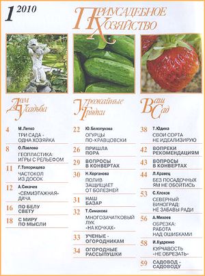 Первый номер наступившего года поведает о геопластике, новом модном поветрии, означающем работу с рельефом. Далее в журнале говорится о возведении забора и дома (как архитектор строил для себя), об огурцах, луке, системах полива, флоксе, китайской иве и т.п. В разделе "Домашняя ферма" особое внимание - буренкам, а также инкубаторам.