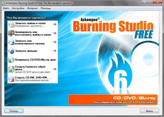 Ashampoo Burning Studio Free - пакет программ для записи CD-RW, DVD-RW, DVD+RW и Blu-ray. Позволяет создавать проекты и записывать CD/DVD (в том числе MP3-CD, VCD, S-VCD и Blu-ray). Поддерживает длинные имена файлов (127 знаков для DVD и Blu-ray и 64 для CD), автоматическую настройку параметров, сохранение и загрузку проекта, создание образов, простое управление файлами с помощью Drag&Drop и многое другое. Работает совместно с большинством (порядка 1700) записывающих устройств.