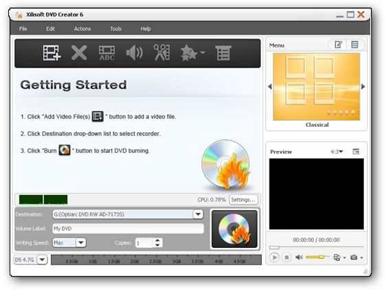 Xilisoft DVD Creator is absolutely the easiest and fastest way to convert popular video formats like AVI, MPEG, DivX, DV, VOB, WMV to DVD movie, DVD folder or ISO files. Owning the ability to create a stylish DVD menu with custom background music, picture, menu topic and opening film, clip video, crop frame size, adjust video effect, add watermark, set audio tracks and subtitles, this DVD creator helps you make a personalized DVD movie.