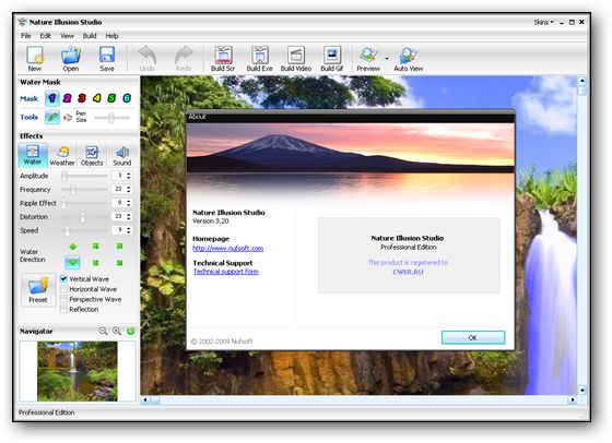 Поставляется вместе с Nature Illusion Studio Professional, программой, которая позволяет создавать реалистичные анимированные изображения с добавлением различных эффектов воды, погоды, звуковых эффектов и анимированных объектов, таких как птицы, звери, рыбы и т.д. к любому выбранному вами изображению. В отличие от оычных скринсейверов, экранные заставки, созданные с помощью данного инструмента, получаются реалистичными и более живыми в придачу со звуковыми эффектами и погодными эффектами.