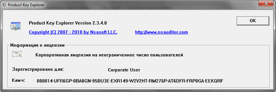Product Key Explorer - позволяет расшифровать и увидеть, а также сохранить серийные номера (Product ID, Product Key, License Info, User Name, Company) продуктов Microsoft, CD-key установленных на компьютере программ, и не только их. Неполный список ПО, регистрационные данные которых можно увидеть и сохранить: Micrsoft Windows (2000, XP, 2003, Vista), Microsoft Office 2003, Microsoft Office 2007, Microsoft Office XP, Micrsoft Visual Studio 2005, Macromedia, Ahead Nero, Adobe Photoshop, CyberLink PowerDVD, Borland Delphi и т.д.