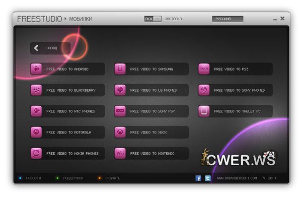 Free Studio - это единый пакет, включающий все бесплатные мультимедийные приложения, разработанные DVDVideoSoft. Free Studio Manager состоит из следующих разделов, позволяющих быстро найти любое из приложений: YouTube программы; MP3 и Аудио; CD, DVD и BD; DVD и Видео; Фотки; Мобилки; Устройства Apple; 3D программы.