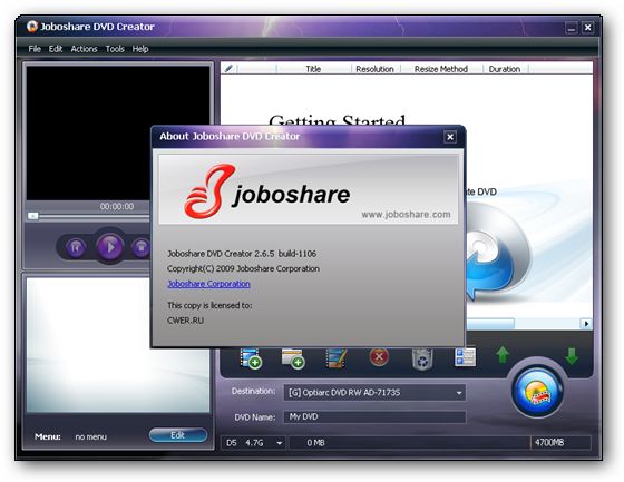 Joboshare DVD Creator - профессиональная программа для конвертирования видео файлов форматов AVI, MPEG, DAT, MPG, WMV, ASF, MP4, 3GP, VOB и записи их на DVD с возможностью редактирования и создания меню. Позволяет определить NTSC или PAL, настроить соотношение видео 4:3 или 16:9, записывать ISO файлы и папки DVD с фильмом. Поддерживает множество форматов DVD, включая DVD-R, DVD+R, DVD-RW, DVD+RW, DVD-5, и DVD-9. Имеет простой и удобный интерфейс.