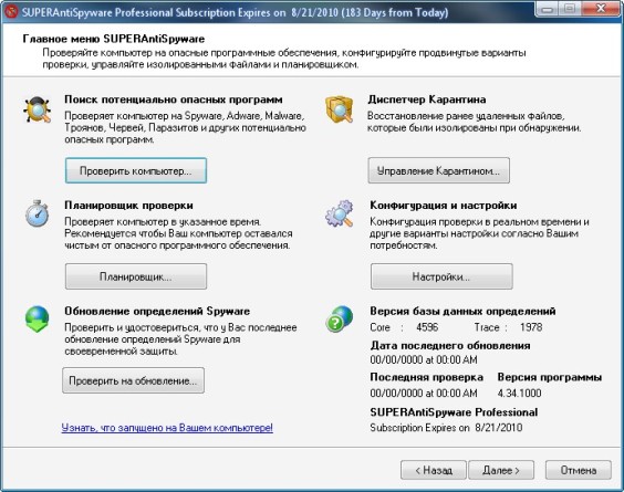SUPERAntiSpyware сканирует память, реестр и файлы на предмет заражения шпионскими модулями. Средствами программы найденных паразитов можно удалить или поместить в карантин. Предусмотрена возможность сканирования тремя способами: при быстром сканировании проверяются только самые распространенные места заражения, при полном - все файлы, а в третьем режиме можно самостоятельно выбрать область проверки. Встроенный планировщик поможет организовать проверку компьютера в заданное время. Кроме этого программа умеет защитить от изменений стартовую страницу браузера, восстановить настройки Интернет-соединений, Рабочего стола, уровня безопасности Internet Explorer и многих других параметров. Чтобы эффективно бороться со шпионскими модулями и вредоносными программами, утилита автоматически обновляет свою базу данных через Интернет.