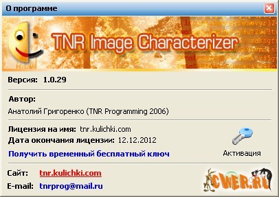 Есть одно маленькое НО: для снятия функциональных ограничений (выводит надпись на результате) TNR Image Characterizer следует абсолютно бесплатно, без всякой регистрации, активировать на сайте разработчика. Ключ действителен до 12.12.2012 года.