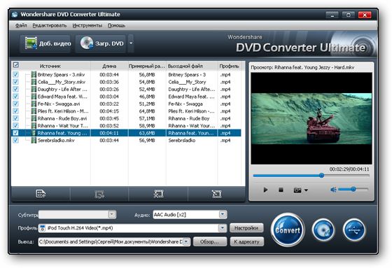 Wondershare DVD Converter Ultimate – многофункциональная программа для конвертирования DVD видео в популярные видео и аудио форматы. Вы можете конвертировать как SD, так и HD видео, в любой видео формат, удобного для вашего медиа плеера или телефона включая iPod (Classic, Nano и Touch), iPhone, Apple TV, Zune, PSP, Pocket PC, Creative Zen, Archos и 3GP мобильных телефонов. Программа удобная и легкая в использовании. Вы сможете добавлять субтитры, редактировать текст, или вставить водяной знак, настраивать видео и аудио поток, захватывать изображения с видео файлов и много другое.