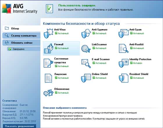 AVG Internet Security - комплексная защита компьютера от всех видов вредоносных программ. В дополнение к антивирусу включает в себя защиту от спама, фишинга, утечки данных, фаервол. В девятой версии на 50% увеличена скорость сканирования, на 10-15% ускорена загрузка, а также уменьшено потребление оперативной памяти.