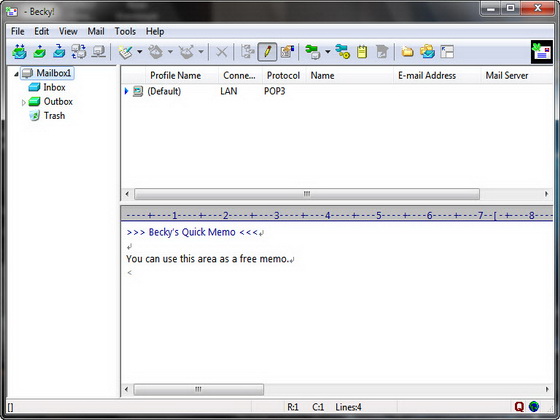 Becky! Internet Mail - почтовая программа с умением создавать HTML-письма, с возможностью приема почты по POP3 и IMAP4 протоколам, с шаблонами и макросами для автоматизации работы с почтой, с возможностью создания нескольких профилей для одного почтового ящика, со способностью напоминать о событиях и автоматически отправлять в назначенный срок поздравления юбилярам, включает встроенное PGP-шифрование, создание аудиописем, менеджер листов подписок и мощные возможности по сортировке писем.