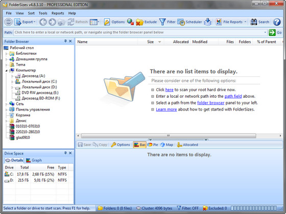 Эта программа позволит вам провести проверку жестких дисков на наличие на них свободного места. Если вы никак не можете понять, почему места осталось так мало, запустите FolderSizes Pro, и программа создаст для вас полный отчет. Программа сгенерирует диаграммы, которые наглядно покажет, какие папки занимают больше всего места. Среди возможностей программы: Распечатка отчетов, экспорт их в HTML; Экспорт диаграмм в файлы JPEG, PNG, BMP или TIFF; Система создания отчетов по типам файлов, которые занимают больше всего места.