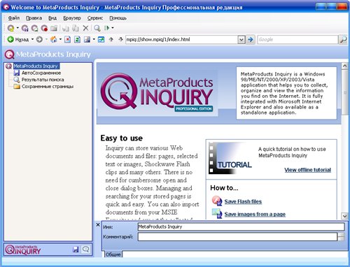 Inquiry - программа позволяет быстро и просто сохранять веб-страницы целиком или некоторые их фрагменты. Открытые вами страницы сохраняются всего одним кликом. Программа имеет встроенный HTML-редактор, возможность поиска внутри сохраненных страниц и многое другое. Предназначена для работы под различными системами Windows и полностью интегрировано в Microsoft Internet Explorer. Помимо интеграции с IE, Inquiry интегрируется в Firefox, а также имеет самостоятельное решение, позволяющее использовать его и в качестве браузера, и в качестве программы для сохранения страниц. В последних версиях добавлено подтверждение, когда страница сохраняется или, если страница с таким адресом уже есть в папке, диалог свойства папки, возможность изменения начальной страницы в браузере программы, возможность показывать последнюю открытую страницу при запуске. Inquiry имеет русифицированный интерфейс и русскую справку для помощи в освоении этой программы.