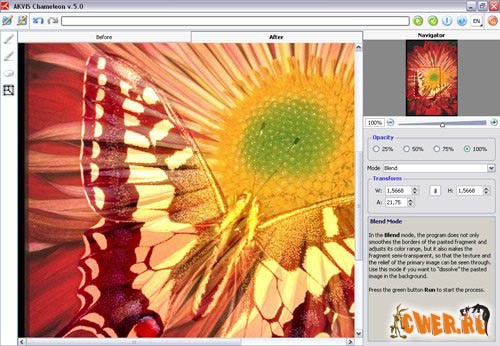 AKVIS Chameleon - программа (плагин) для Photoshop для тех, кто любит создавать коллажи и удивительные художественные композиции. Chameleon бережет ваше время и силы, так как не требует точного выделения объектов и тщательной обработки границ между вставкой и фоном. Именно поэтому программа получила такое название - она "хамелеонит", приспосабливает цвета.