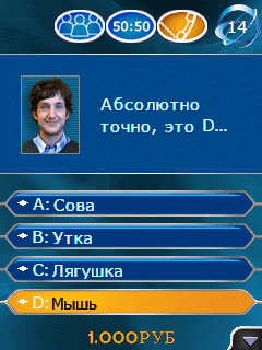 Примите участие во всемирно известной телеигре в новой мобильной версии 2010 года! Популярная викторина возвращается с совершенно новыми вопросами и возможностями! Выбирайте колоритных персонажей из предложенных или создайте собственного персонажа с помощью камеры своего телефона! Используйте улучшенную подсказку «Звонок другу», чтобы избежать трудностей на пути к победе! Проверьте свои знания и реакцию в отборочном туре и штурмуйте 15 вопросов, каждый из которых будет делать вас все богаче и богаче. Сможете ли вы стать виртуальным миллионером 2010? Размеры экранов: 128x128, 128x160, 176x220, 240x320.