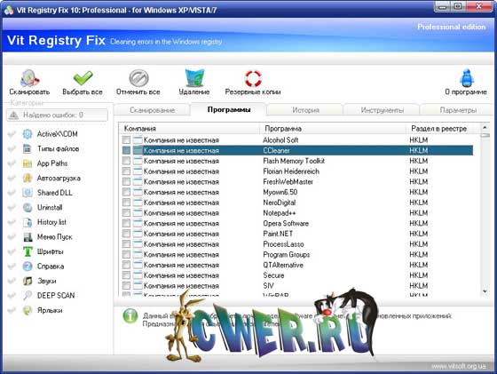 Vit Registry Fix - программа для очистки реестра от ненужных записей (ошибок). Так как после удаления програм в реестре оставляются различные ненужные записи, то со временем этих записей становится все больше и больше и это является причиной долгих задержек перед загрузкой програм, снижение общей производительности системы и других ошибок. Vit Registry Fix находит эти ошибки и разделяет их на категории (ActiveX\COM,Типы файлов, AppPath, автозагрузка, Shared DLL, Uninstall, History list, меню ПУСК, Шрифты, Справка, Звуки, Ключи Software (Deep scan) и дополнительно ищет битые ярлыки на дисках. Также есть возможность ручного удаления ключей из разделов Software (как для HKCU так и для HKLM), создания резервных копий перед удалением ошибок а также можно создать список исключения.