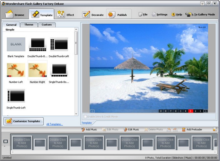 Wondershare Flash Gallery Factory - очень мощная и в тоже время простая в пользовании программа для создания Flash галереи. Wondershare Flash Gallery Factory включает в себя большой набор шаблонов, которые позволяют делать разнообразные презентации снимков, как для web дизайна, так и обычные flash слайд шоу. Цифровой фотоальбом, 3D flash галерея, web галерея, flash слайд шоу, а также flash баннеры, можно создать в Wondershare Flash Gallery Factory без навыков программирования.