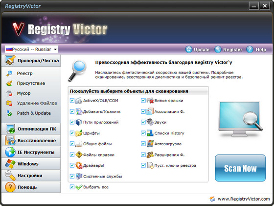 Как только проблемы обнаружены приложением, Registry Victor предложит вам профессиональное и высокоэффективное решение для вашего компьютера. С использованием Registry Victor на регулярной основе ваша система будет поразительно стабильна. Registry Victor сканирует весь компьютер на возможные ошибки, которые ведут к проблемам в реестре. Происхождение у них может быть разное, но для программы это не имеет значения – она справиться со всем легко и быстро.