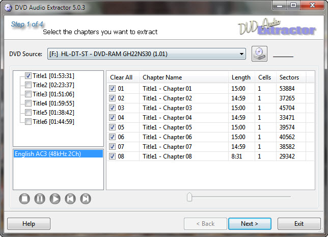 DVD Audio Extractor features on its easy-to-use interface, ultra-fast extracting speed, rich audio formats support, multi-channel capability, resample to arbitrary sample rate, audio preview and much more. It's all what you needed to get audios out of DVD discs, so that you can listen on MP3 Player, play on PC, record to CD or do anything else.