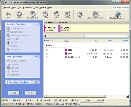 EASEUS Partition Master — удобная программа для разбиения жёсткого диска на разделы, которая не только упростит рутинные задачи, но и поможет вам редактировать разделы диска и управлять ими. А именно — быстро и с лёгкостью создавать, удалять и форматировать разделы, изменяя их размер и расположение без потери данных, с использованием свободного места на диске. С помощью этой программы, вы можете создавать, удалять, форматировать разделы на вашем жестком диске быстро и просто. К наиболее привлекательной функции относится способность изменения размера/перемещение ваших разделов, используя свободное место, без удаления данных.
