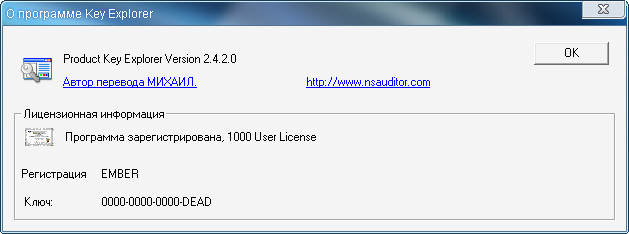 Product Key Explorer - позволяет расшифровать и увидеть, а также сохранить серийные номера (Product ID, Product Key, License Info, User Name, Company) продуктов Microsoft, CD-key установленных на компьютере программ, и не только их. Неполный список ПО, регистрационные данные которых можно увидеть и сохранить: Micrsoft Windows (2000, XP, 2003, Vista), Microsoft Office 2003, Microsoft Office 2007, Microsoft Office XP, Micrsoft Visual Studio 2005, Macromedia, Ahead Nero, Adobe Photoshop, CyberLink PowerDVD, Borland Delphi и т.д.