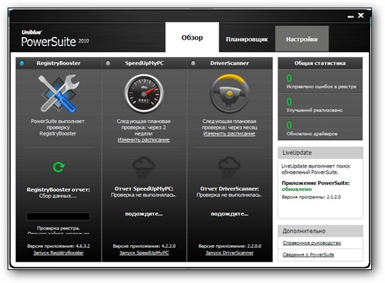 PowerSuite - комплексное решение для поддержания производительности компьютера. Ускорения работы системы, очистка и оптимизация реестра, обновления драйверов. Слияние RegistryBooster, DriverScanner и SpeedUpMyPC в рамках единого интерфейса - PowerSuite, повышает скорость и стабильность.