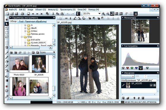 Hornil StylePix - программа, позволяющая ретушировать фотографии, изменять их размер, повернуть, провести цветокоррекцию, наложить текст, сделать фотоколлаж, вырезать, копировать и вставлять фотографии, применять различные фильтры, удалять эффект красных глаз и многое, многое другое. И это бесплатно. Имеет интуитивно понятный пользовательский интерфейс. Он предназначен для легкого и удобного управления отдельными функциями.
