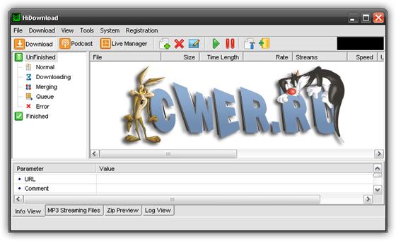 HiDownload - менеджер загрузок. Поддерживает работу по протоколам HTTP, FTP, RTSP (Windows Media), PNM, MMST и MMSU (это значит, что потоковое аудио - RA, RM и Apple Quicktime Streaming - можно "скачать" без проблем). Может работать через прокси, позволяет просматривать архивы и скачивать из них только необходимые файлы, позволяет сохранять Flash, имеется встроенный поиск MP3-файлов. Кстати говоря, есть у этой программы и внутренний поиск.