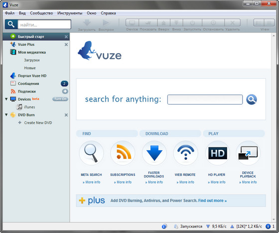Vuze - это популярная программа для работы в Peer 2 Peer сети BitTorrent со значительно более богатым ассортиментом функций, чем фирменный клиент сети. По большому счету все богатство функционала заключается в более продвинутом подходе к управлению закачками, чему способствует симпатичный и удобный интерфейс. Немаловажным достоинством является наличие функций трекера — возможность поиска torrent файлов. Стоит упомянуть поддержку плагинов, кои можно скачать с сайта разработчика.