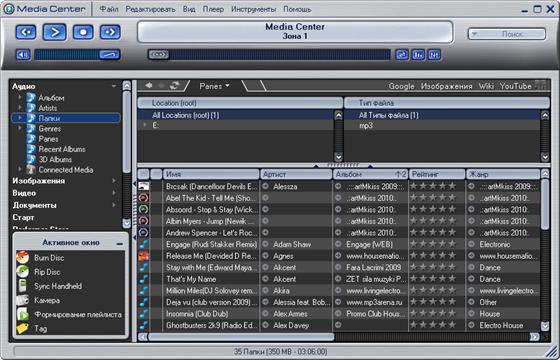 J.River Media Center - мультимедийный центр. Проигрывает большинство популярных аудио и видео форматов, включая MP3, аудио CD и DVD, может преобразовывать CD-аудиотреки в WAV и MP3, переписывать на жесткий диск виниловые диски и кассеты, а также создавать аудио-CD, причем для всех этих функций программа имеет множество настраиваемых параметров. Кроме этого, есть очень хороший и мощный по своим возможностям органайзер мультимедийных файлов, медиаредактор, эквалайзер, встроенный DSP и удобный планировщик заданий для автоматизации процессов проигрывания/записи, а также поддержка пульта ДУ. Из необязательных, но приятных функций - становящаяся уже почти стандартом для "приличных" программ возможность изменения внешнего вида с помощью скинов, мини-режим проигрывателя и "телевизор".