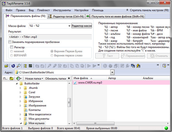Tag&Rename - программа, предназначенная для ручного управления музыкальными файлами. С помощью данной утилиты Вы сможете быстро и легко переименовать вашу музыкальную коллекцию, используя встроенную информацию в тегах, создавать новые или редактировать существующие теги, а также создавать теги, основанные на именах файлов...