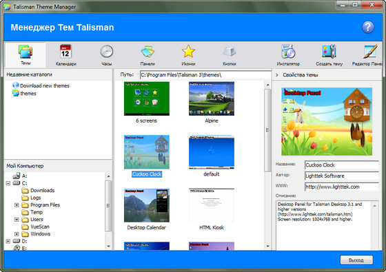 Talisman Desktop (Talisman) - программа-оболочка для Windows 9x/Me/NT4/2000/XP/2003/2008/Vista/7 , позволяющая создавать новые интерфейсы Рабочего Стола Windows. Вы можете создать свой собственный интерфейс "с нуля" либо воспользоваться сотнями готовых "тем" доступных в интернете.