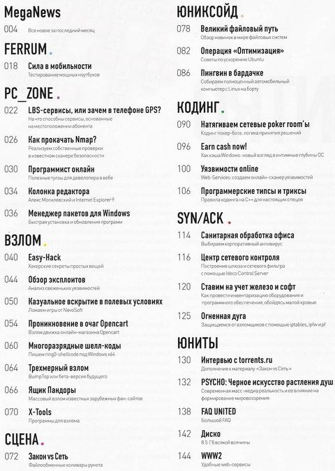 Журнал, рассказывающий о компьютерах, программном обеспечении, железе, технологиях, играх и, конечно же, о хакерах. Но на этом все не ограничивается. В журнале публикуются материалы о стиле жизни, о жизненных вещах, о здоровье, о том, как провести свободное время. Издание также отличается манерой подачи материала.
