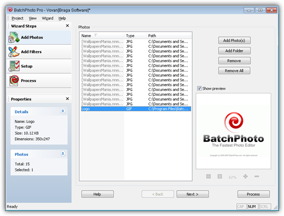 BatchPhoto Pro - помощь начинающему фотографу справиться с коррекцией фотографий и не задумываться об установке сложных в работе программ вроде фотошопа. По словам разработчика, всего за одну операцию можно легко подкорректировать или выправить картинку, применить эффекты (более 30), а также пакетно переименовать до нескольких тысяч файлов. Все просто - выделяете группу картинок и правите их одним махом все вместе.
