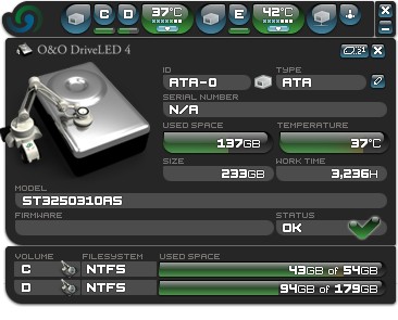 O&O DriveLED также показывает текущую температуру жестких дисков и прогнозирует продолжительность жизни каждого устройства. Сразу после установки программы вы можете выполнить полное тестирование жестких дисков, установленных в вашем компьютере, включая проверку электроники, механики и тест поверхности. Программа проанализирует внутренние журналы ошибок, которые ведутся средствами S.M.A.R.T. и выдаст общую оценку его исправности жестких дисков. Помимо мониторинга исправности O&O DriveLED также позволяет визуально контролировать обращения к жестким и сетевым дискам, а также логическим разделам.