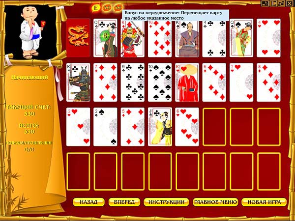 Красочный пасьянс в восточном стиле. Цель игры – разложить все имеющиеся карты в две стопки. Чем больше карт вы выиграете, тем выше будет ваш ранг. Несложные правила и приятная атмосфера этого пасьянса наверняка придутся вам по душе и помогут отдохнуть от трудовых будней.
