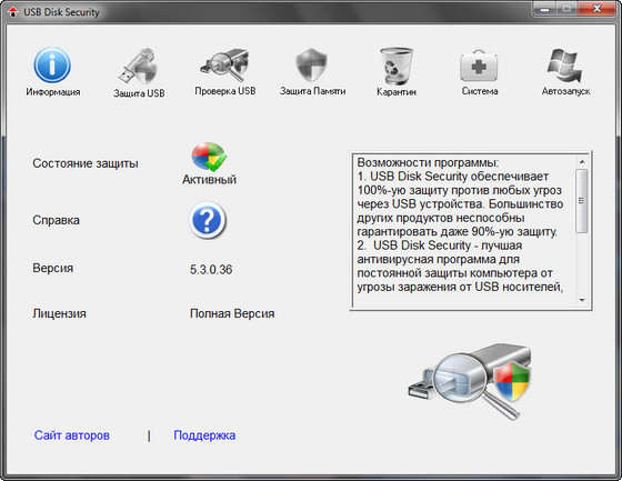 - USB Disk Security - лучшая антивирусная программа для постоянной защиты компьютера от угрозы заражения от USB носителей, без надобности в обновлениях сигнатур, отлично работающая с вашим основным антивирусом.