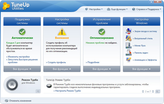 TuneUp Utilities были полностью обновлены: новое Главное окно является еще более легким для использования и обеспечивает еще более быстрый доступ к каждой функции.
