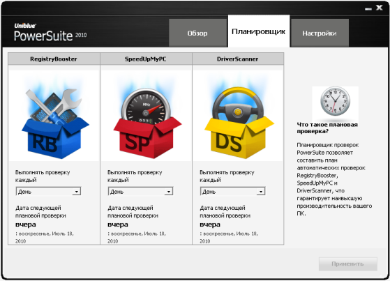 Uniblue PowerSuite 2010 - является полным решением для повышения производительности компьютера. Слияние RegistryBooster, DriverScanner и SpeedUpMyPC в рамках единого интерфейса, PowerSuite повышает и защиту уязвимых групп, но очень важных элементов системы привязаны к скорости и стабильности.