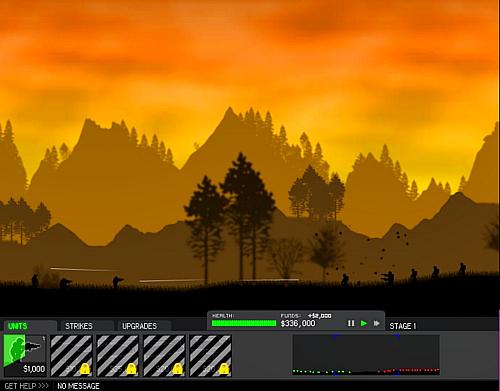 На вкладке Units расположены кнопки для создания солдат и военной техники, Strikes - ракетные и артиллерийские удары, Upgrades - улучшения которые позволяют использовать более разрушительное оружие. Не подпускайте врагов к левой границе экрана, иначе будете терять жизни.