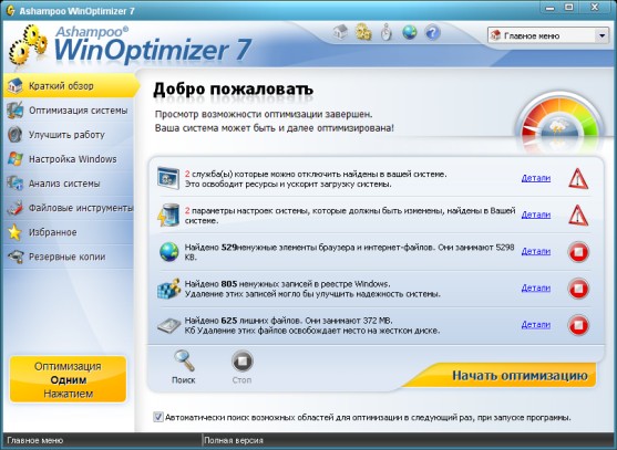 Ashampoo WinOptimizer - новая 7ая линейка пакета программ, позволяющего оптимизировать операционную систему за счет ее настройки и очистки. Включает в себя утилиты для очистки жесткого диска и системного реестра, модуль для обеспечения защиты личной информации путем поиска и удаления файлов и данных, оставшихся после интернет-cepфингa, утилиту для оптимизации интернет-соединения, модуль для настройки программ, автозагружаемых одновременно с запуском системы, а также модули для поиска и удаления ненужных фaйлoв DLL, для безвозвратного удаления данных и для шифрования файлов. Кроме этого, программа позволяет переназначать ассоциации файлов, шифровать и расшифровывать файлы, а также безвозвратно их удалять. Наконец, возможна настройка параметров системы и ее оптимизация за один клик. В шестой версии программы появилось немало новых возможностей, новые модули, включая новый антишпионский модуль и менеджер контекстного меню Windows, а также множество улучшений и исправлений.