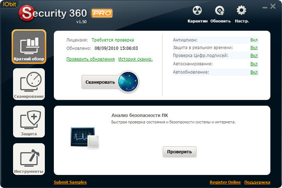 Благодаря своему движку и эвристическому анализу, IObit Security 360 определяет наиболее сложные и скрытые программы-шпионы и вредоносные объекты быстро и эффективно. Поддерживает защиту в реальном времени, обеспечивает автоматические обновления баз данных. Приложение может работать, не конфликтуя, с Вашим антивирусом для обеспечения наилучшей безопасности ПК.