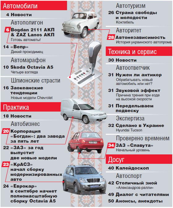 Еженедельное издание, полностью посвященное миру автомобилей. В издании представлено максимум информации о автомобилях и не только. Основные рубрики журнала: Автосалон, Автополигон, Концепции, Авторынок, Автобизнес, События и выставки, Практические технические и юридические советы, Спорт и другое.
