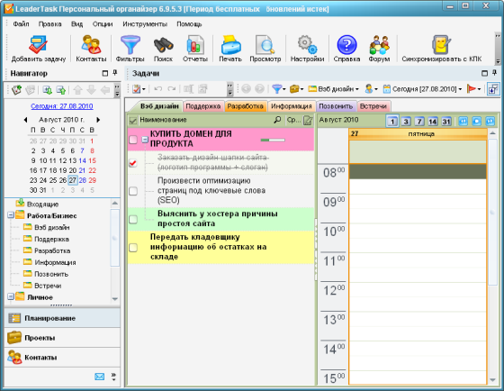 LeaderTask - это умный органайзер для лидеров! Интеллектуальная система управления проектами, событиями, задачами, контактами, освободит вас от рутины и даст больше времени для творчества. LeaderTask поможет вам избавиться от различных поглотителей времени, поможет вам увидеть четкую перспективу жизни, иметь подробный обзор дел, задач, вы будете ставить более высокие цели и достигать их. Кроме того, LeaderTask - это еще и удобный менеджер проектов, с помощью которого можно легко планировать и управлять вашими личными делами, а также бизнес проектами.